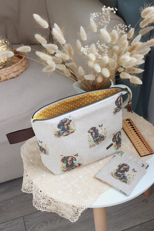 Handmade To Order Knitting Project Bag with Built-in DPN Holder & Matching Squeeze Purse – “Dachshund & Butterfly” Print | Printed Digital Canvas Fabric | Mustard Dot Lining