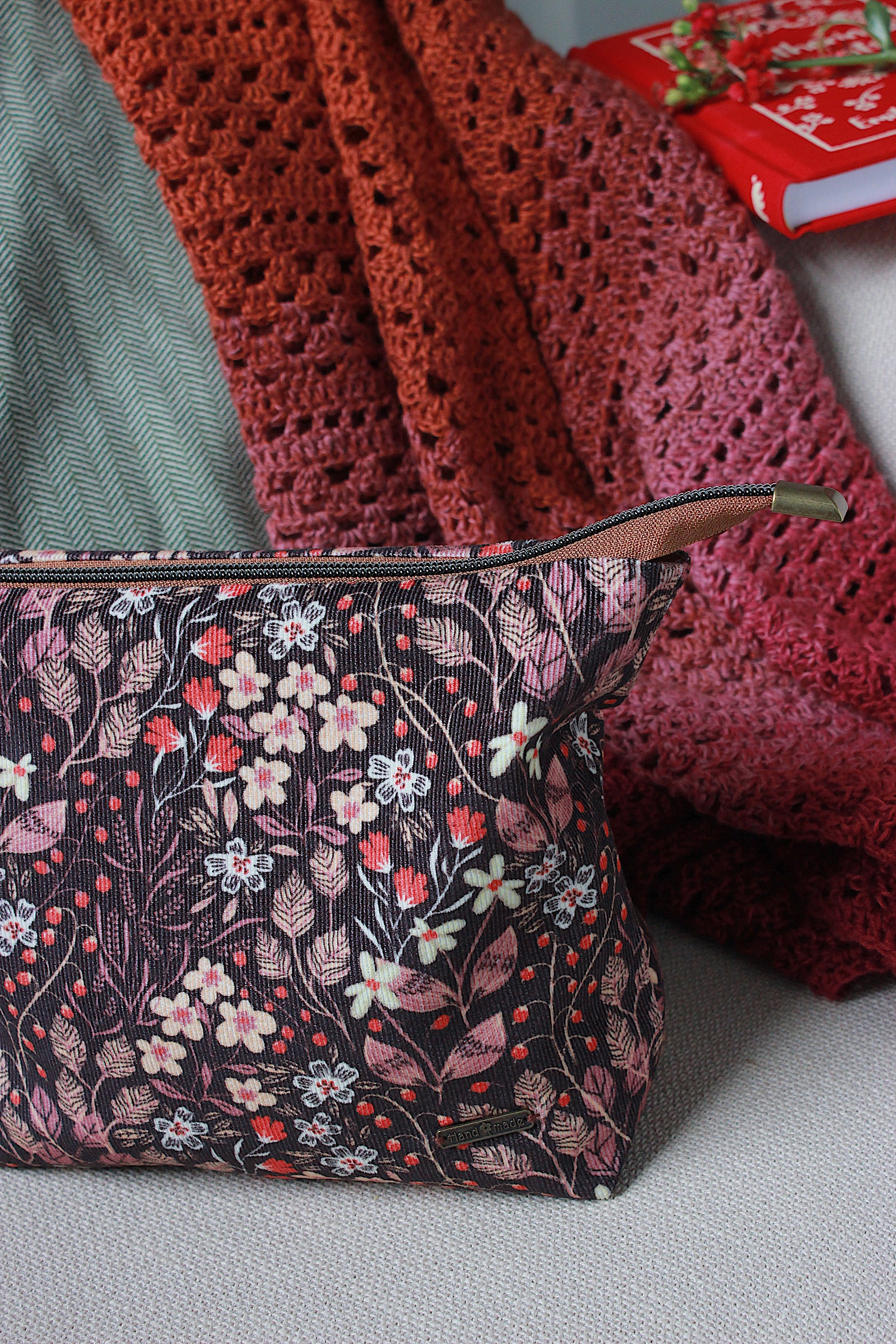 Crafted from 100% high-quality cotton needlecord fabric with a dusky floral/berry print. Fully lined with 100% cotton. Soft and lightweight bag. The DPN holder is double reinforced with cotton fusible interfacing for added durability. Finished with a metal zipper with a decorative pendant and plastic button snaps, a metal sew-on "Handmade" label, 100% cotton webbing.