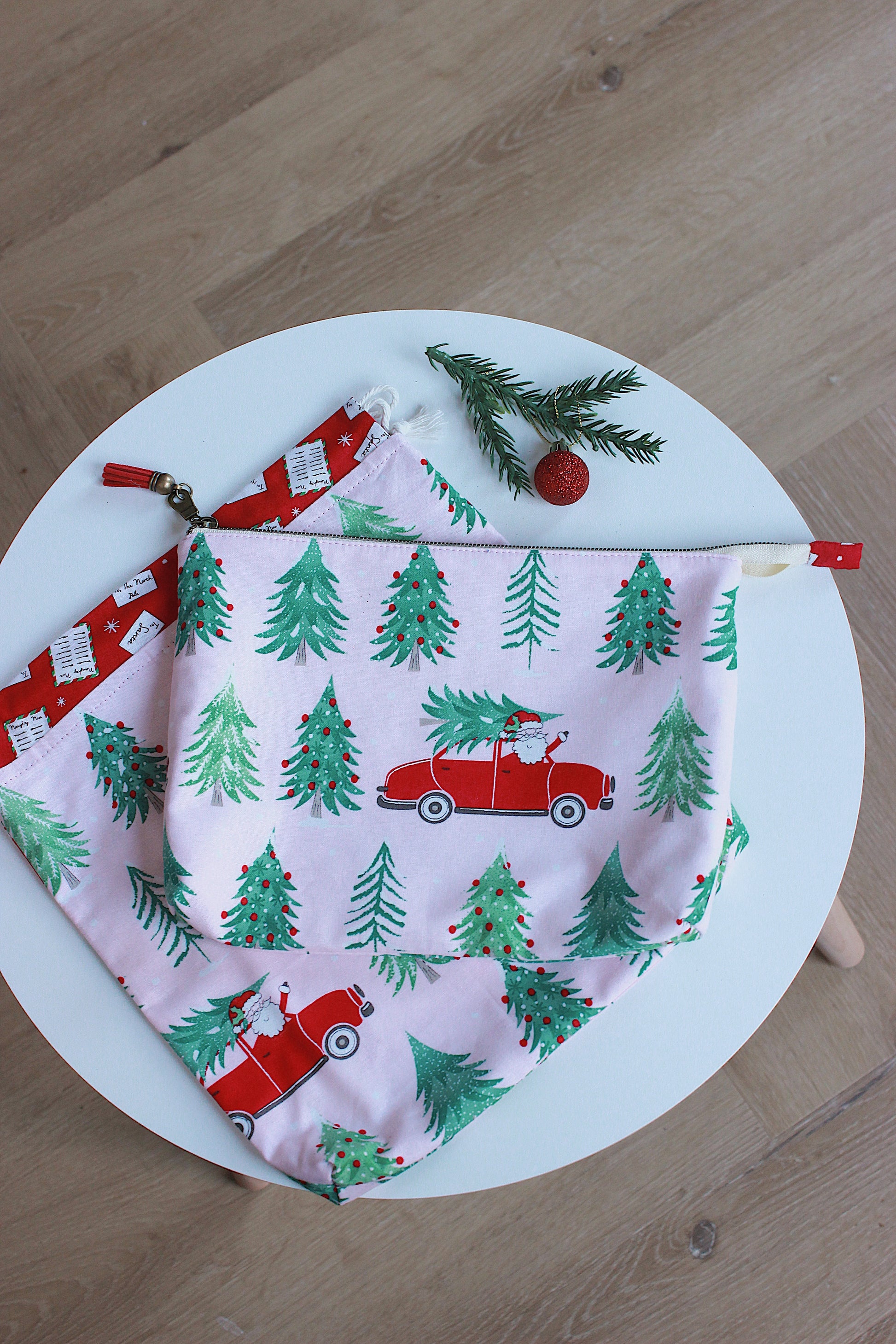 Crafted from 100% high-quality cotton fabric with Christmas pattern. Fully lined with 100% cotton, the notions pouch double reinforced with cotton fusible interfacing for added durability. Finished with a zipper, a decorative pendant, a cotton cord drawstring, a metal lobster, a ribbon.