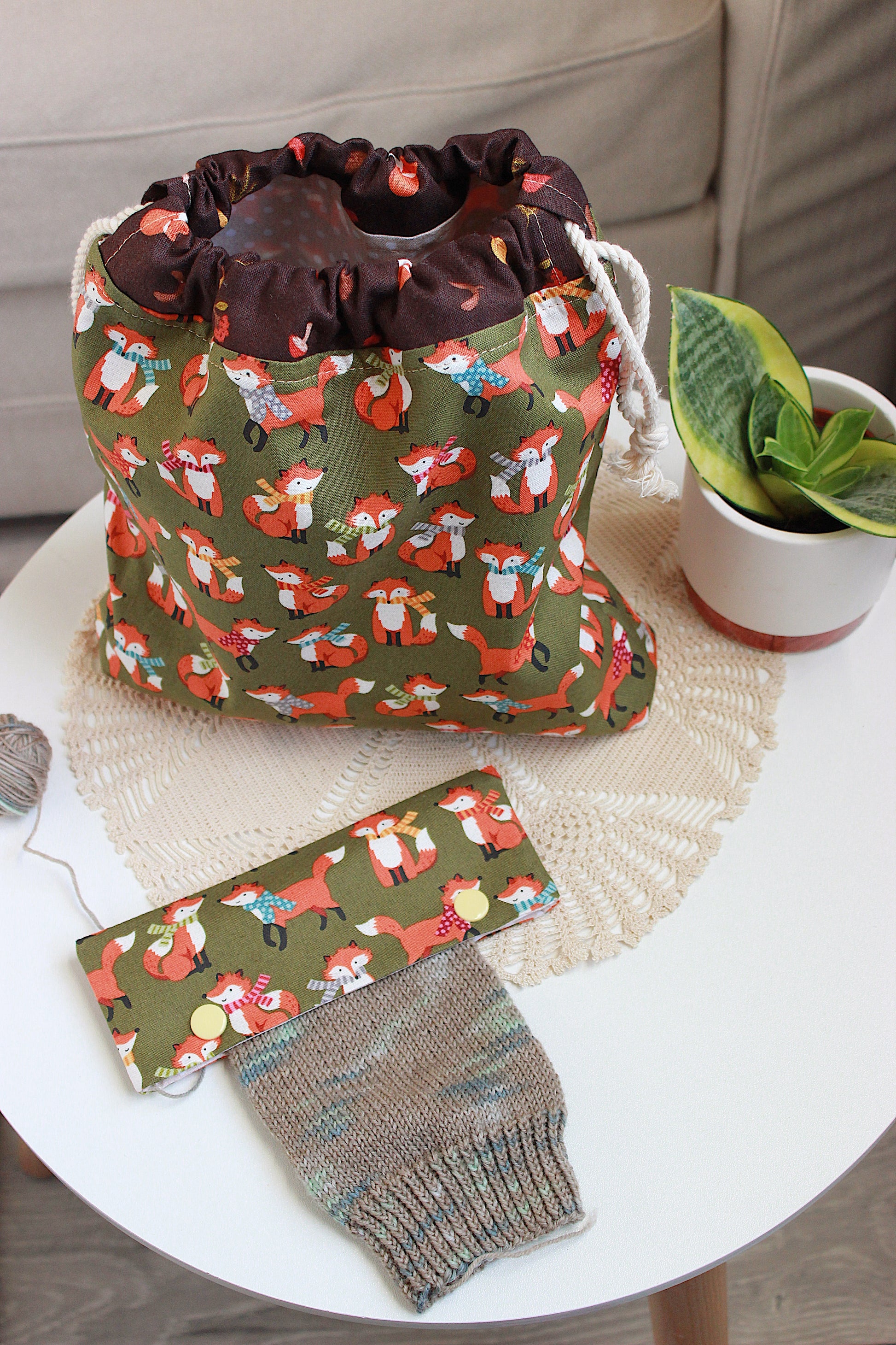 The drawstring project bag and matching needle holders are made from sturdy cotton fabric, decorated with cheerful foxes in colourful scarves.