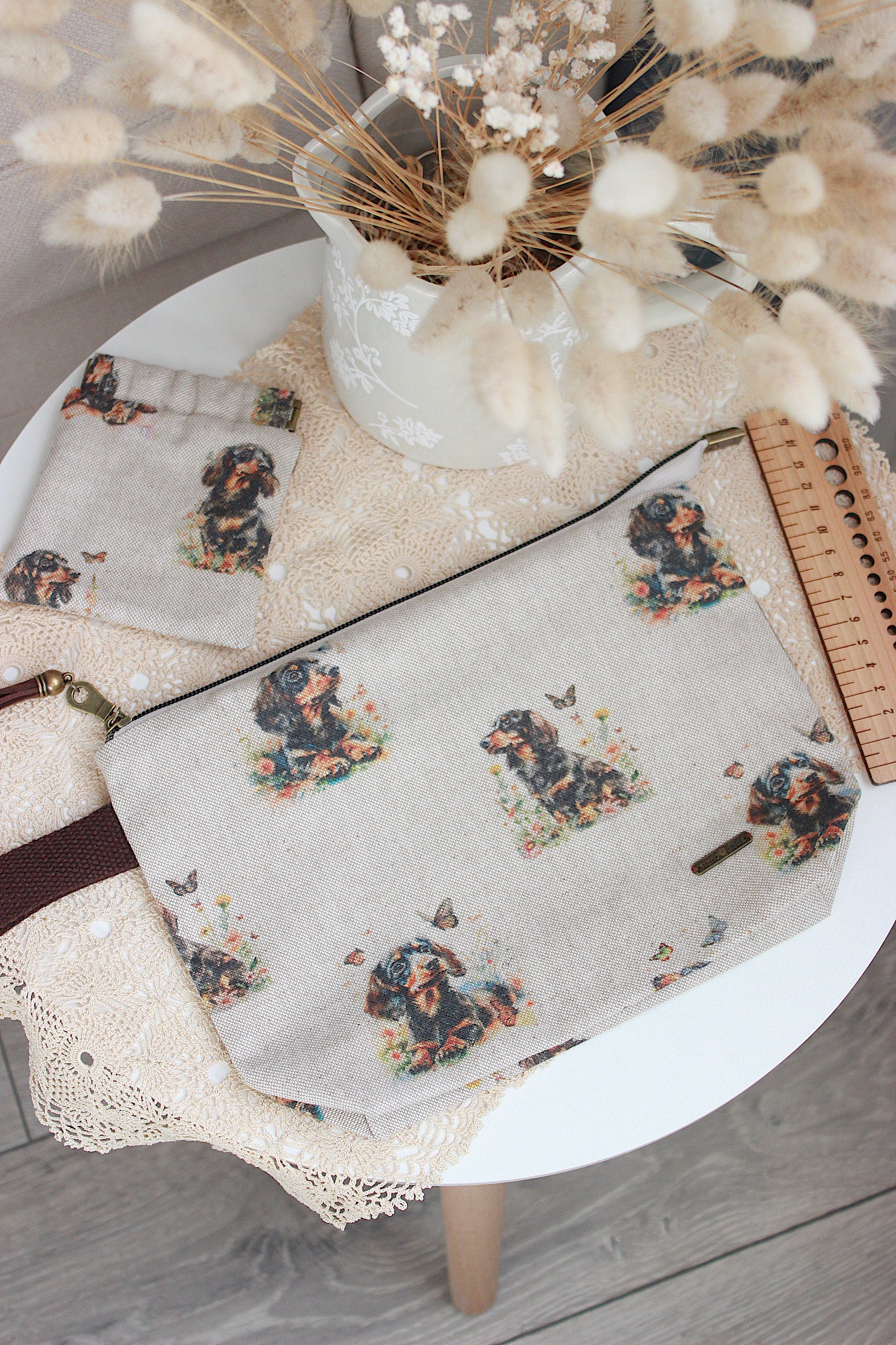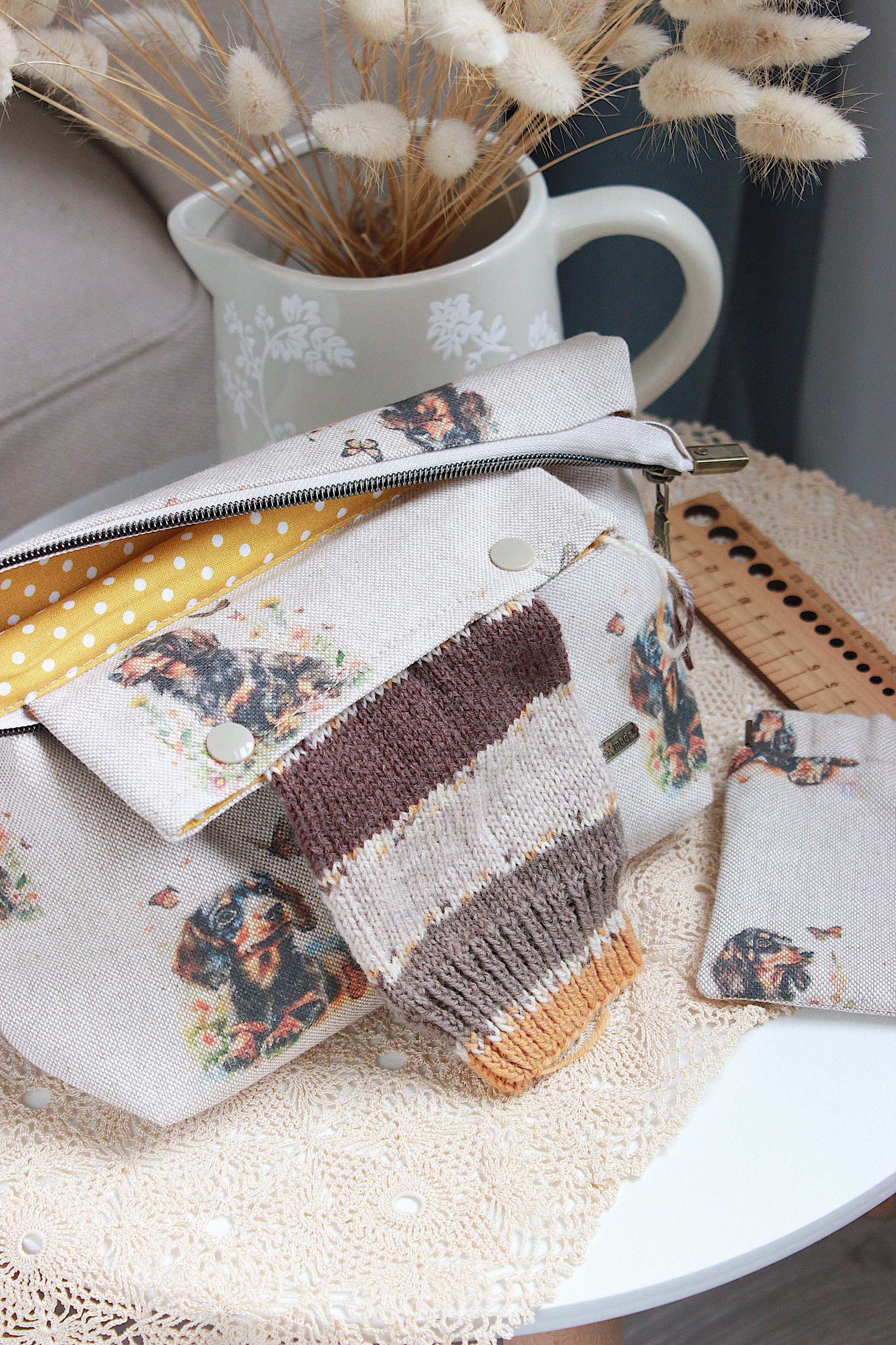 A cosy, handmade project bag with a dachshund print, thoughtfully designed by me with both function and charm in mind. Whether you’re knitting at home, commuting, or heading to your favourite café, this bag keeps everything in place - so you can focus on the joy of making. Featuring delicate dachshunds surrounded by butterflies and wildflowers print on natural cotton, it’s both practical and full of character - the perfect home for your yarn, needles, and works in progress.