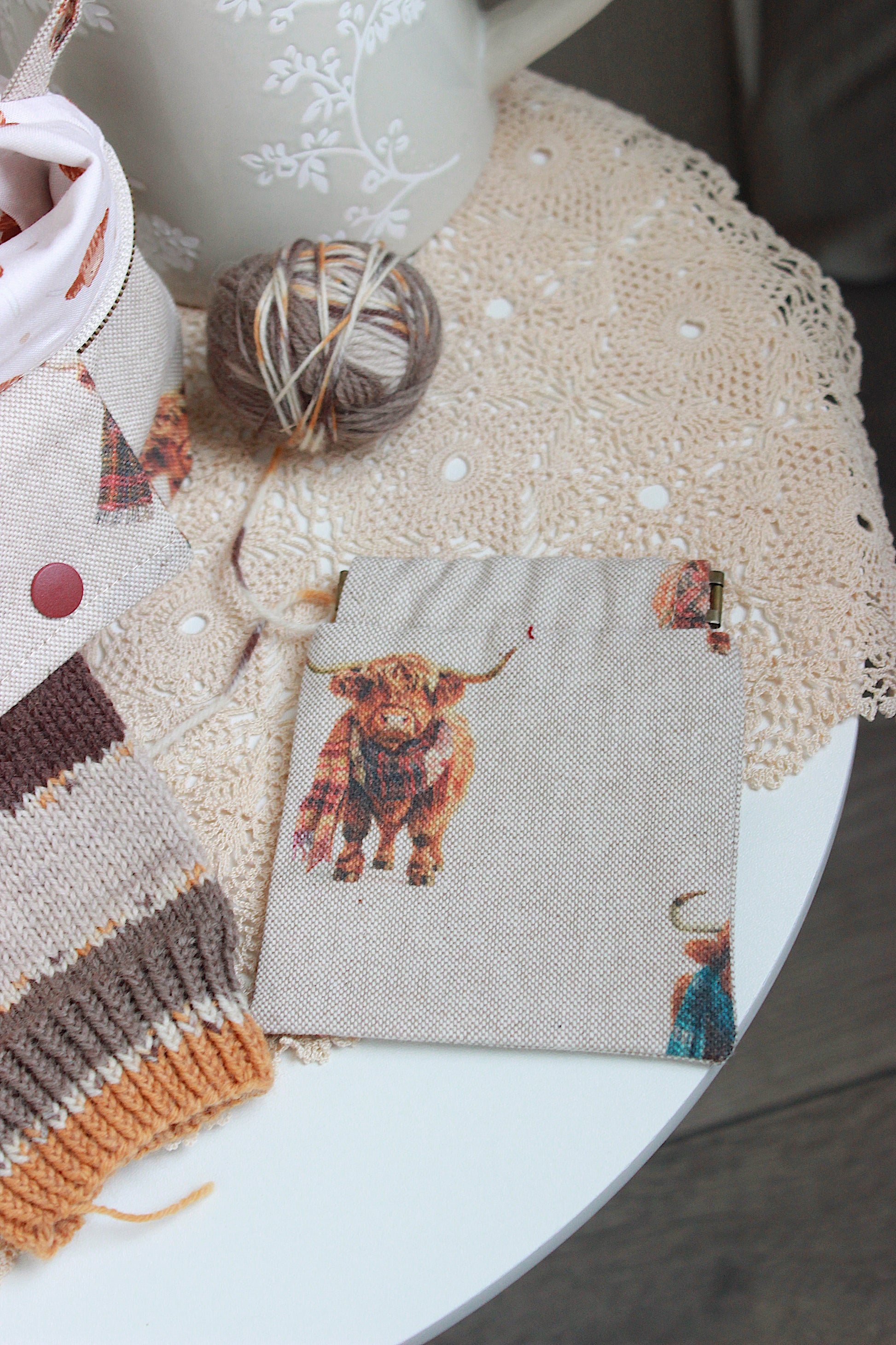 A cosy, handmade project bag with a Highland Cows print, thoughtfully designed by me with both function and charm in mind. Whether you’re knitting at home, commuting, or heading to your favourite café, this bag keeps everything in place - so you can focus on the joy of making. Featuring highland cows printed on natural cotton, it’s both practical and full of character - the perfect home for your yarn, needles, and works in progress.