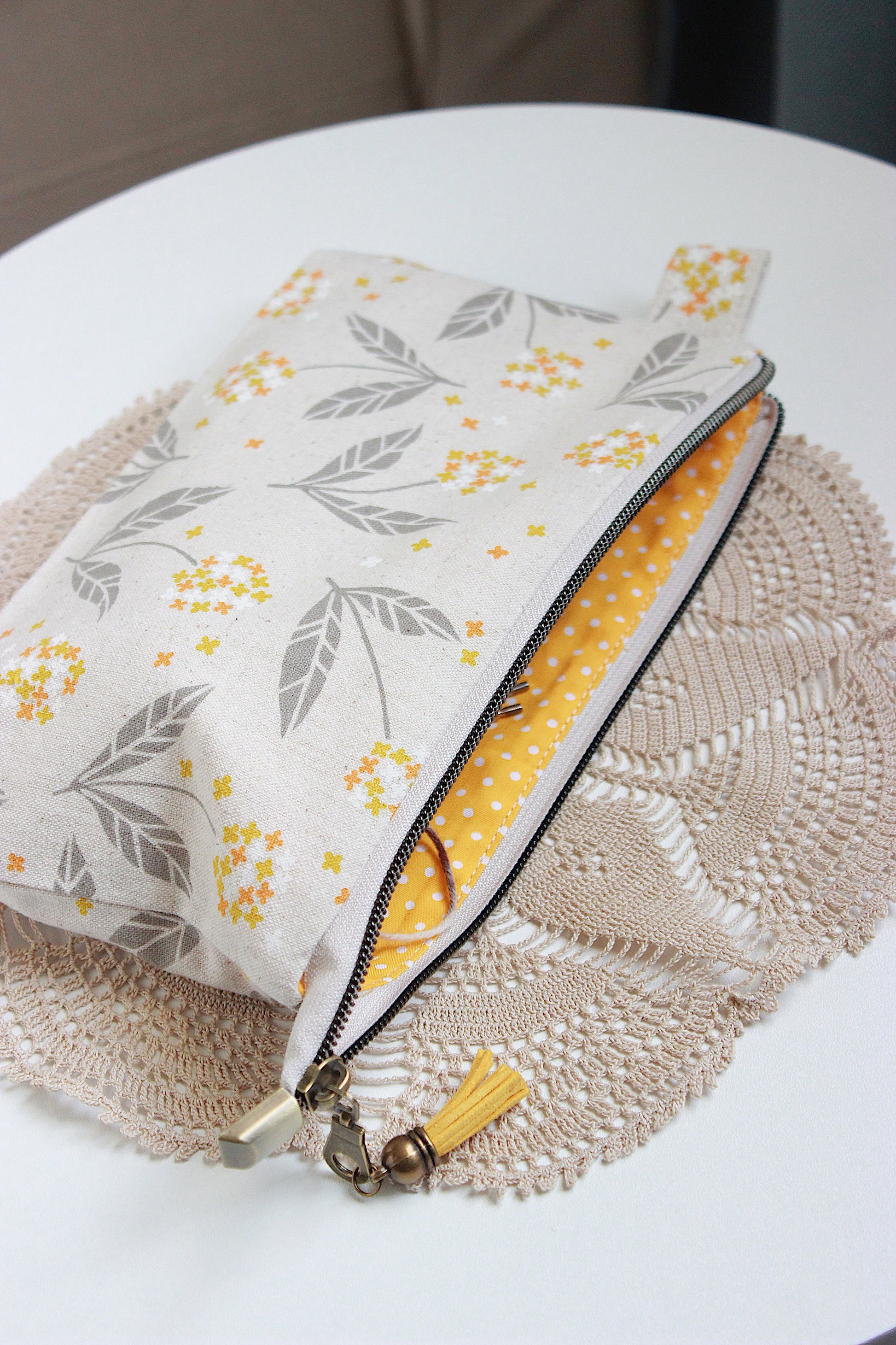 The notions pouch is made from a premium linen-cotton blend with a delicate floral print. Inside, the bright yellow polka dot lining brings a cheerful contrast. Multiple compartments provide space for interchangeable needles, cables, scissors, and other small notions. Has a fabric loop to hold markers or a thread guide. A secure zipper closure with tassel detail keeps everything in place, whether you craft at home or on the go.
