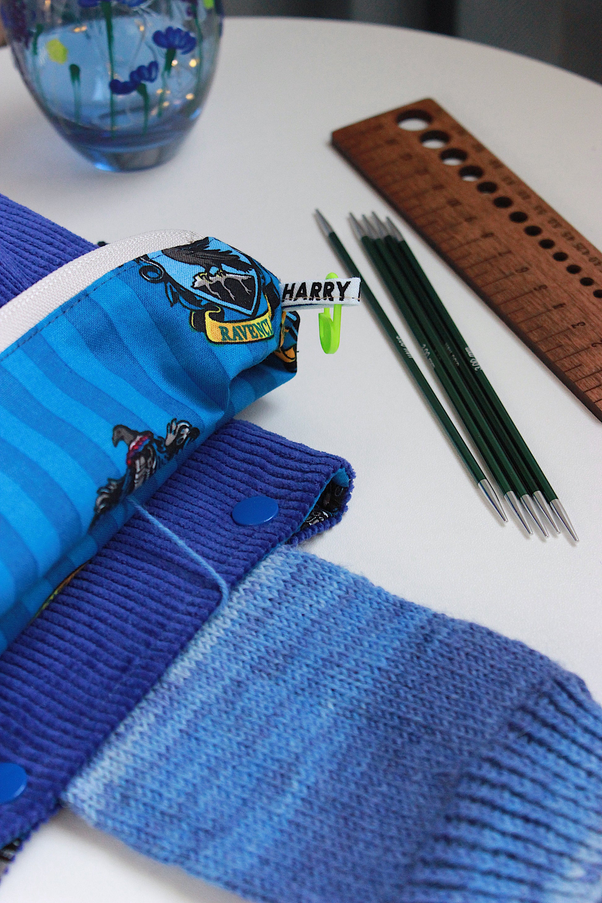 A magical blue project bag for sock and small knitting or crochet projects, inspired by the Ravenclaw house colours - perfect for Harry Potter fans who like to keep their WIPs neat and tangle-free.